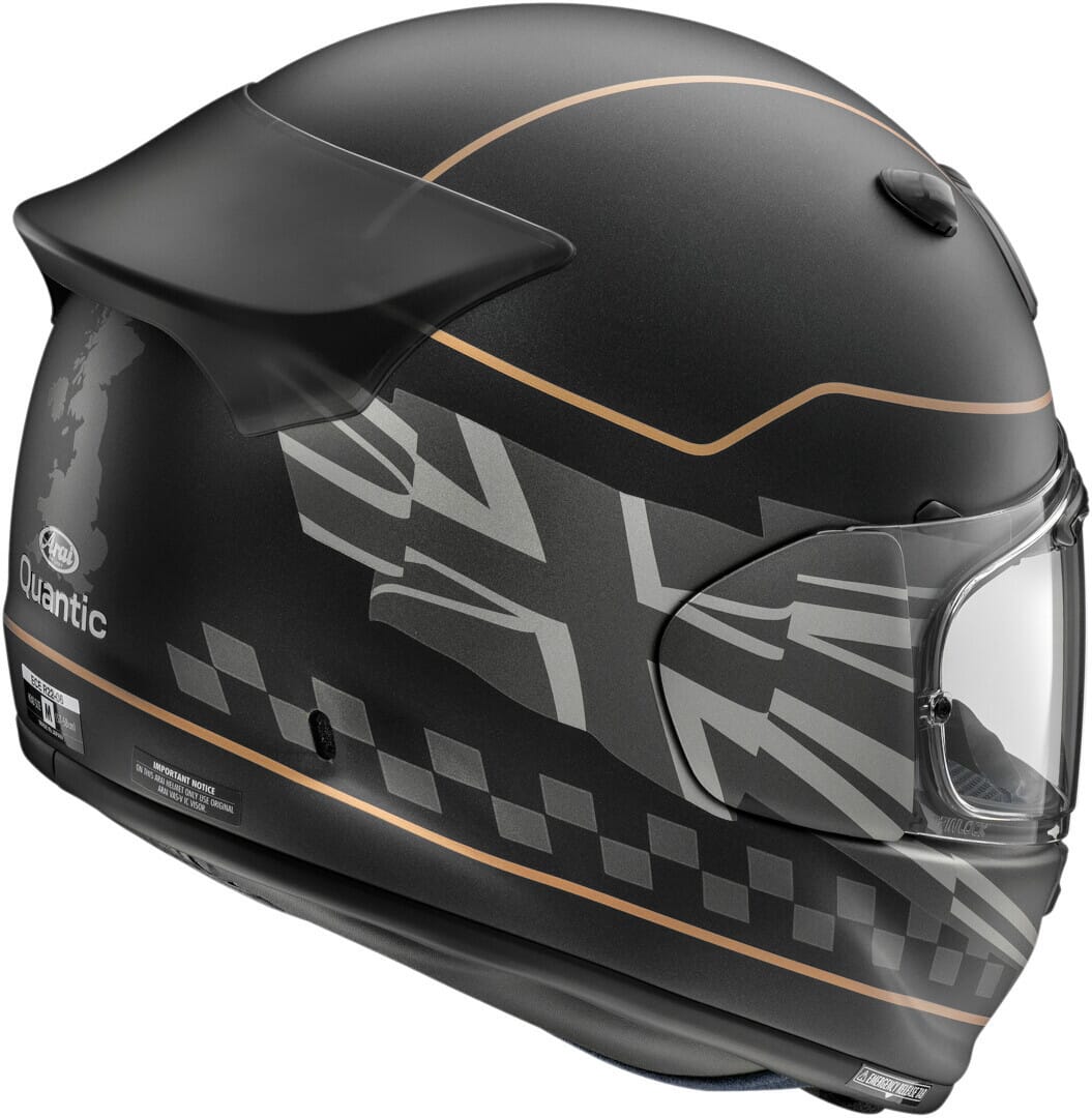 Arai Quantic har samme VAS (Variable Axis System) visirsystem som de andre helhjelmene fra Arai, men ventilasjonen er annerledes. Interiøret er også helt nytt og byr på fin komfort. Skallets ovale, glatte form gjør at det ikke er noe som kan huke seg fast ved et uhell - klar sikkerhetsgevinst. Hjelmen er designet med tanke på kravene fra det meget store sportstouringsegmentet, noe både sportsførere og touringførere vil verdsette. Quantic leveres med Max Vision VAS visir og Pinlock MaxVision.